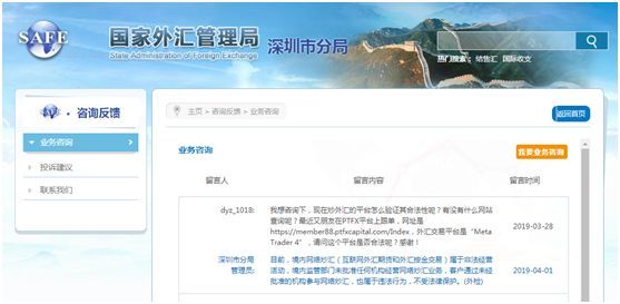 本年3月底,曾有网友正在邦度外汇局官网深圳分局磋商:我念磋商下,现正在炒外汇的平台如何验证其合法性呢?有没有什么网站盘查呢?近来有恩人正在PTFX平台上跟单,网址是,外汇营业平台是“Meta Trader 4”,请问这个平台是否合法呢?
