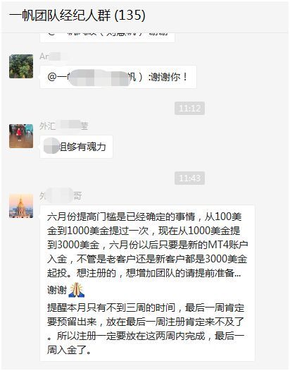 据不齐全统计,记者所正在群的处理员职掌的微信群仍旧众达69个,一个群满员为500人。记者从PTFX普顿外汇的此中一个团队“一帆团队经纪人群”涌现,该团队中的经纪人数抵达135人。一名处理员正在群中示知通盘经纪人“六月份”升高MT4账户的入金门槛至3000美元。也即是说,资金池范围将进一步扩展。