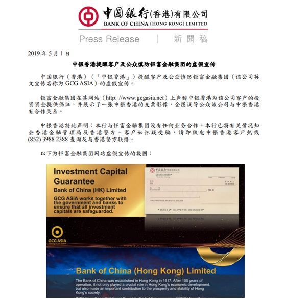 “GCG ASIA鉅富金融”的骗局可谓是毛病百出,还编造与中邦银行601988)(香港)有限公司互助,联合保护投资者的资金平和。5月1日,中银香港揭橥声明“指点客户及民众慎防鉅富金融集团的作假传扬。”