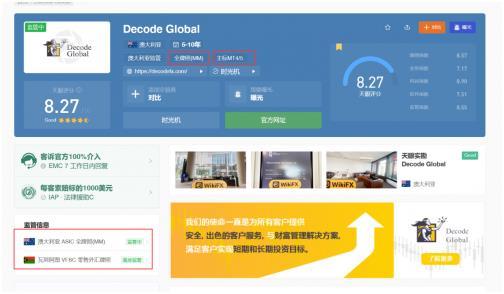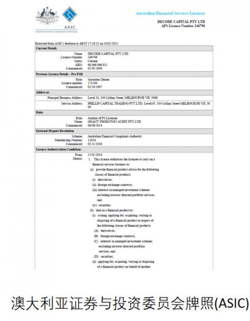 澳大利亚证券与投资委员会执照(ASIC)于2001年遵照澳大利亚《证券和投资委员会法》建立,依法独立对公司、投资举动、金融产物和办事行使监禁本能,现当前澳大利亚证券与投资委员会执照(ASIC)曾经成为了全邦限制类权衡一个平台正轨与否的苛重目标,Decode Global平台所属的Decode集团能持有ASIC执照,凑巧讲明了其势力之雄厚。