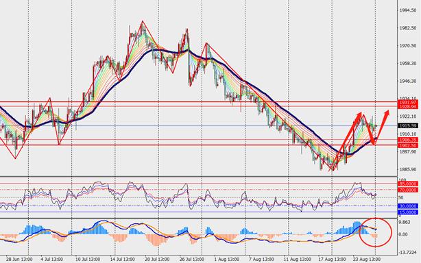 技巧面:黄金H4级别正在1922邻近遇阻后回落,金价运转于48日众空分界线之上。