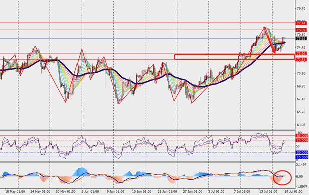本领面:原油H4级别碰到下方赤色支柱带之后开启反弹,目前如故受阻于上方压力带邻近,假使不行进一步冲破,后期恐连续下行。