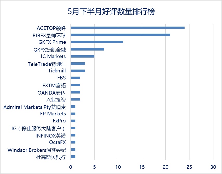 5月16日至31日,收到好评的经纪商有:ACETOP领峰,BIBFX皇御全球,GKFX Prime,GKFX捷凯金融,IC Markets,Tickmill,TeleTrade特理汇,兴业投资,OANDA安达,FXTM富拓,FBS,杜高斯贝银行,Windsor Brokers温莎经纪,OctaFX,INFINOX英诺,IG(中断任事大陆客户),FxPro,FP Markets,Admiral Markets Pty艾迪麦(按好评数目从众到少排序),近半个月来用户对经纪商予以好评的原因,也会集正在其是否具备肯定史书口碑,以及相差金是否神速上。