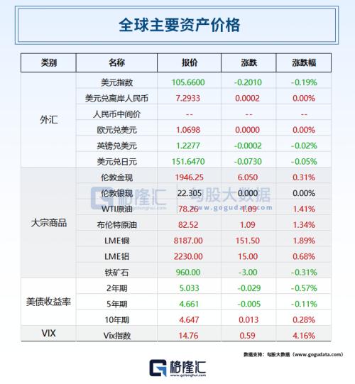 环球资产展现上,美元指数向上迫临106后转跌,日元跌至约152创一年新低后一度转涨,离岸群众币最高升破7.29元。现货黄金转涨上逼1950美元。OPEC看好今明两年需求,油价涨超1%至一周新高。美邦短债收益率盘中转跌,长债收益率尾盘回吐涨幅。