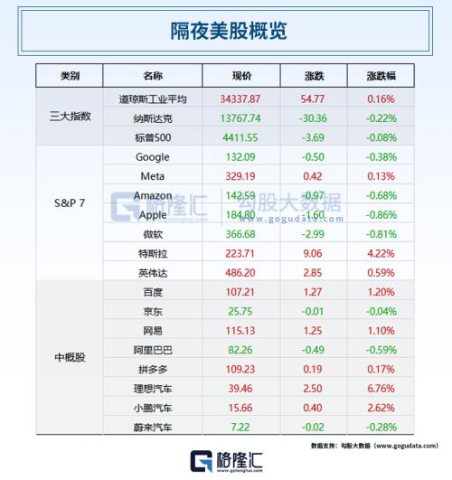 美股方面,三大指数收盘涨跌纷歧,道指涨0.16%至近八周新高,标普500指数跌0.08%,纳指跌0.22%。