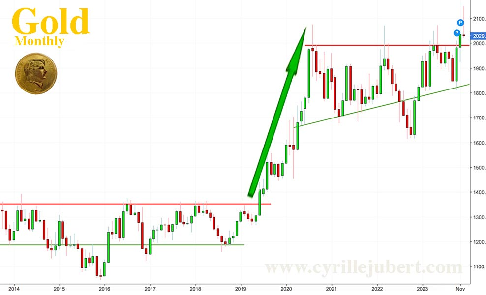 Cyrille指出,考核黄金2014-2019年月度阻力位被冲破后发作的境况很兴味。金价正在15个月内从1354美元上涨至2072美元。同样的上涨将使金价正在2025年1月或2月到达3170美元,美元进货力大幅降落。