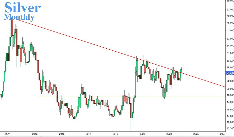趁着金价失控,银价正在月收市时冲破了自2011年高点以还不停受阻上涨的斜阻力位。