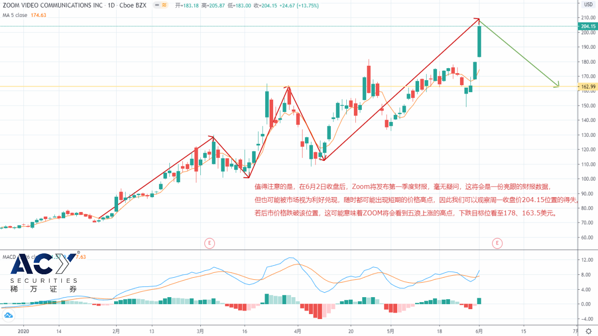 值得谨慎的是,正在6月2日收盘后,Zoom将揭晓第一季度财报,毫无疑难,这将会是一份亮眼的财报数据,但也也许被墟市视为利好兑现,随时都也许闪现短期的价钱高点,于是咱们能够查察周一收盘价204.15场所的得失。若后时价格跌破该场所,这也许意味着ZOOM将会看到五浪上涨的高点,下跌方针位看至178、163.5美元。