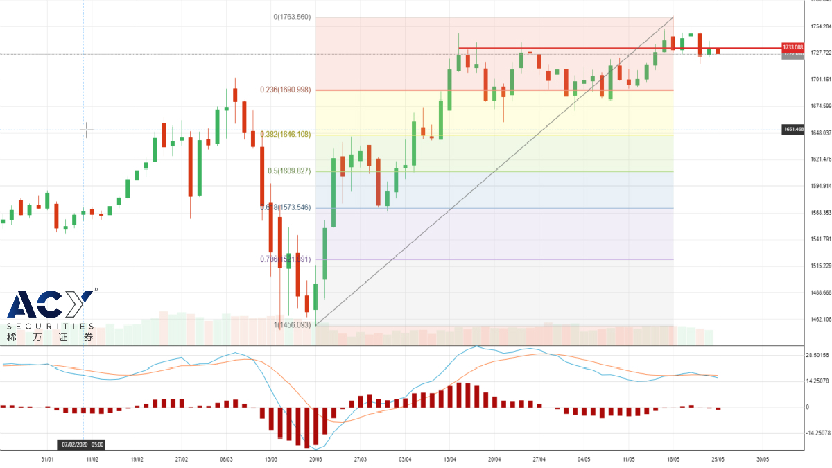 【ACY稀万证券】澳洲4月就业降幅创记录,澳美0.6400处企稳反弹5月15日(周五),隔夜美元指数改良4月24日以后高点至100.56,只是跟着美股大幅回升,美元回吐大个人涨幅。现货黄金一度涨逾20美元,改良近三周高点至1736.55美元/盎司,投资者担心永久经济疲弱和营业危机相闭,提振了黄金的避险需求。美油6月合约飙升10%,创近一个月新高至27.96美元/桶,因上周美邦原油库存不测削减且IEA缩减需求跌幅预测。