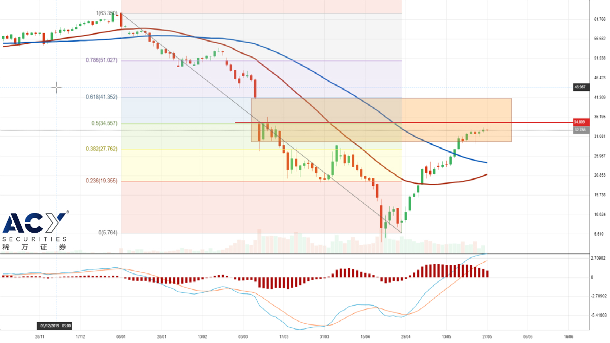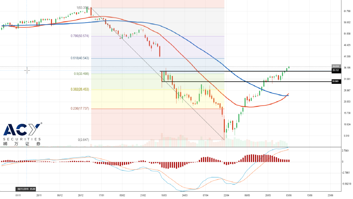3、美原油冲破34.60大闭,行情已发轫回补此前跳空白口,众头趋向希望延续