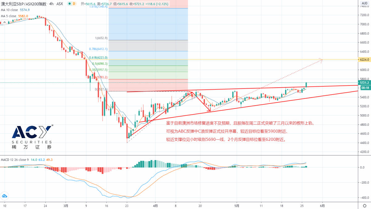 时间面来看,澳洲200指数从3月23日睹疫情底以后,反弹幅度大幅落伍于美股以及欧洲股市,但凭据2008年经济告急中的史乘经历来判定,澳洲经济复原进度较疾,股市正在经济反弹的流程中响应较为滞后,但反弹的后半程速率显著加疾。于是鉴于目前澳洲墟市修复进度不足预期,且股指正在周二正式冲破了三月以后的楔形上轨,可视为ABC反弹中C浪反弹正式拉开序幕,较近方针位看至5900左近、较近撑持位睹小时级别5690一线左近。个股方面,发起闭切机构大幅增持的西农集团(WES),方针价上移至36.6澳元,以及电信公司(TPG)、黄金矿企(RMS)等根本面连续向好的个股标的。