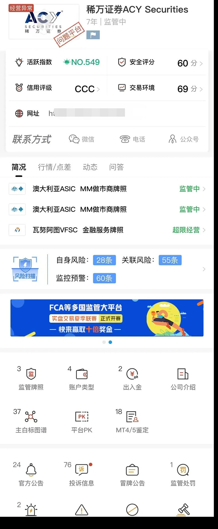 据海投排行显示,稀万证券ACY Securities兴办7年,环球排行549,安好评分惟有60分。遵循稀万证券ACY Securities官网显示,ACY受ASIC和瓦努阿图双重监禁。