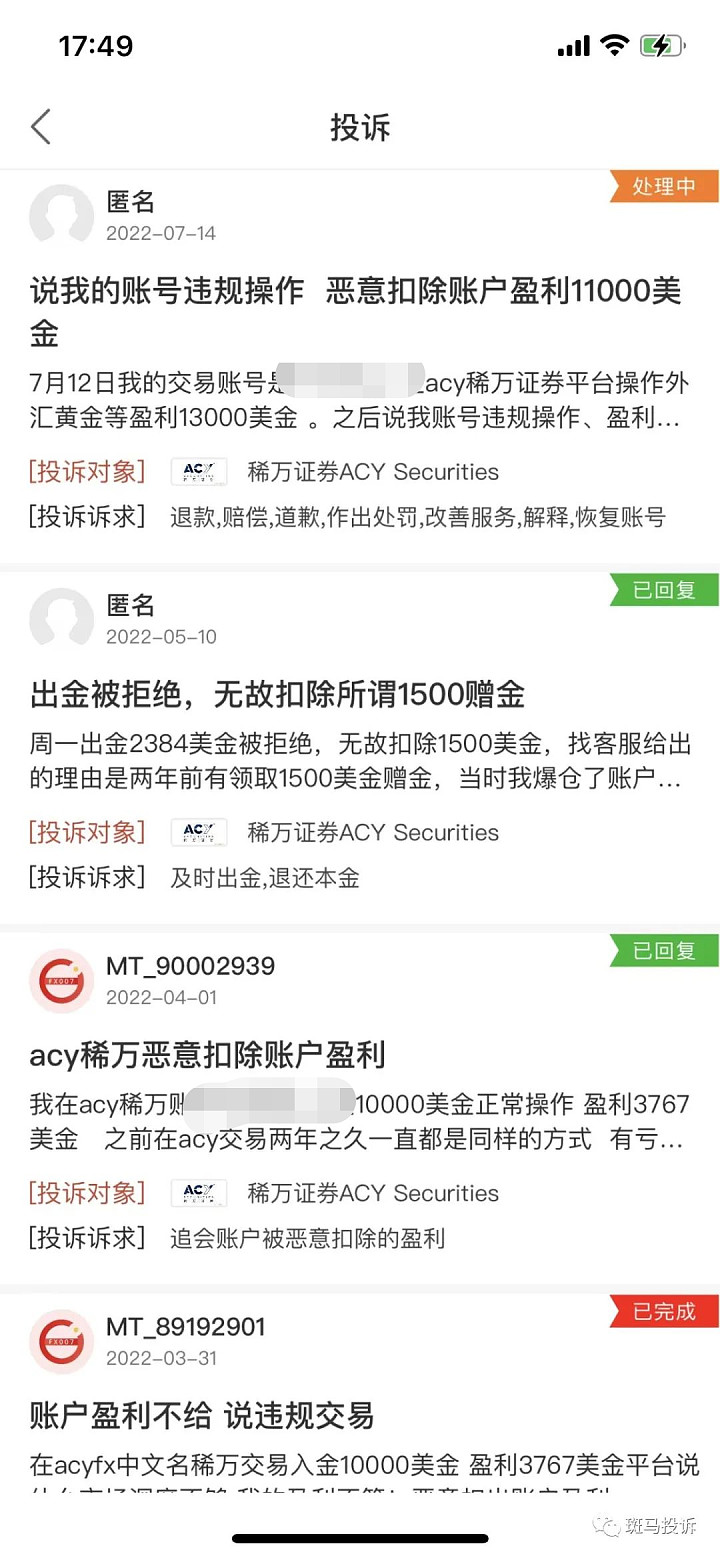 据斑马投诉上显示,目前稀万证券ACY Securities的投诉高达78条,这个中均包罗无故扣除赠金,扣除账户赢余,滑点点差大,爆仓等种种题目酿成了投资的卑劣处境,乃至对付用户的投诉更是视而不睹,刚愎自用的,云云的平台依然不适合大家投资者。
