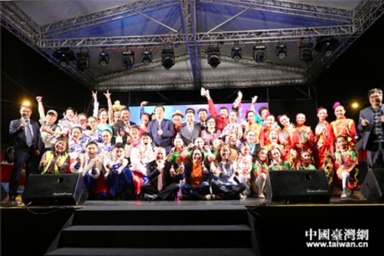 北京市台湾同胞联谊会党组书记王兰栋和来自两岸介入晚会的艺员和处事职员合影纪念。(中邦台湾网 郜利敏 摄)