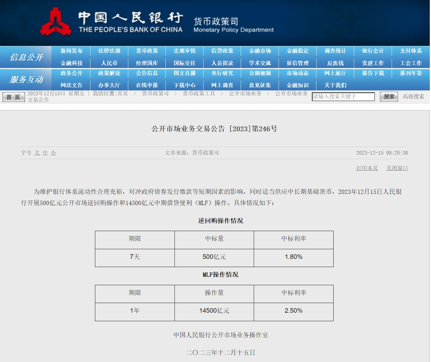 12月15日,央行官网讯息称,今日展开500亿元公然市集逆回购操作和14500亿元中期假贷方便(MLF) 操作,利率永别为1.8%、2.5%,均同此前坚持相同。