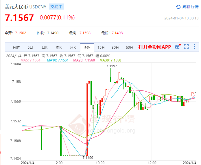 截至发稿,报价7.1567,涨幅0.11%,最高价7.1598,最低价7.1498,今日美元/群众币汇率开盘价7.1502。