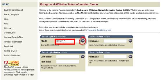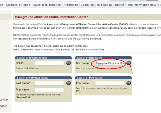 第三步:正在NFAID中输入囚系号,好比美邦百利金融集团有限公司(Peregrine Financial Group)的囚系号为“0232217”,点击“go”。或者正在Firm name中输入美邦百利金融集团有限公司的英文名称“Peregrine Financial Group”,点击“go”,也可能。