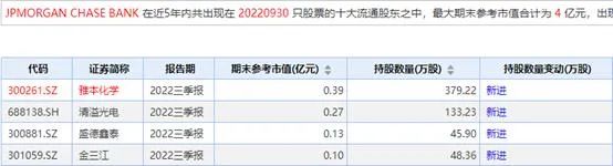 数据显示,摩根大通三季度末持有雅本化学379.22万股,持仓市值为0.39亿元,占贯通股本的0.4%;持有清溢光电133.23万股,持仓市值0.27亿元,占贯通股本的1.63%;持有盛德鑫泰45.9万股,持仓市值0.13亿元,占贯通股本的1.73%;持有金三江48.36万股,持仓市值0.1亿元,占贯通股本的1.4%。