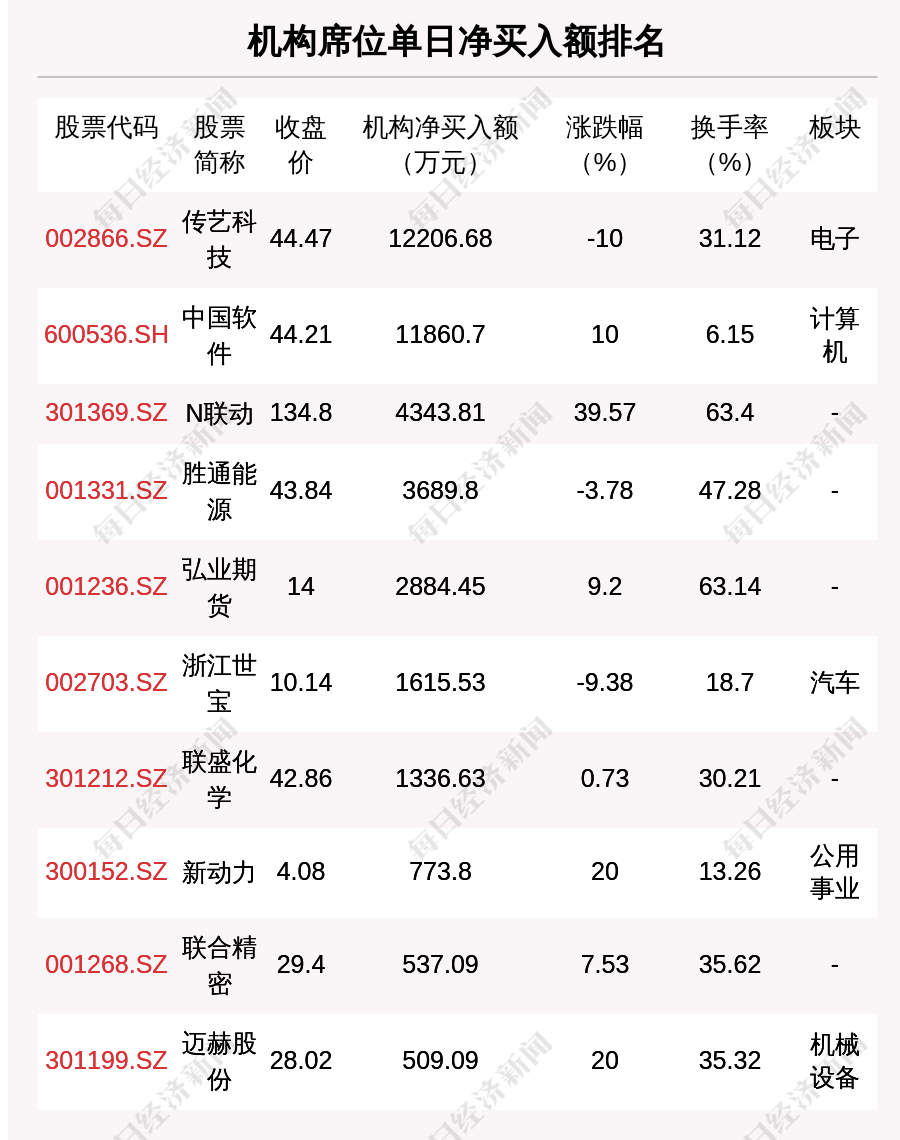 正在龙虎榜中,涉及机构专用席位的个股有15只,净买入额前三的是传艺科技、中邦软件、N联动,阔别为1.22亿元、1.19亿元、4343.81万元。