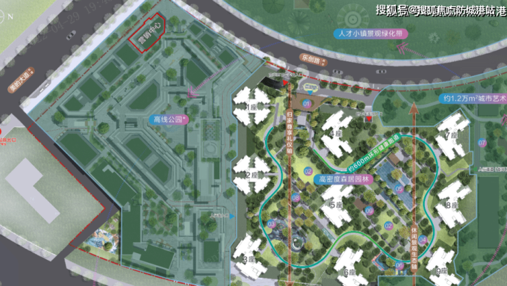 两轴三环九节点,高氧森居公园住区。中海汇德里,约70%软景植物掩盖率,全维度空间高密度种植。