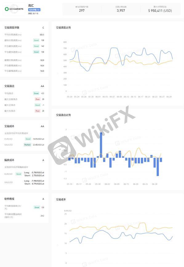 进入详情页能够呈现,有297位用户到场GO MARKETS · 高汇的测评,来往订单总数达3957笔,累计占用确保金950,411 (USD)。最终取得的归纳评级为 AA级。此中来往速率评级为C,均匀来往速率585.5 (ms)。来往滑点方面评级为AA,均匀滑点-0.3。主流泉币兑均匀来往本钱较低,来往本钱评级为AA级。其余,隔夜本钱和软件断线方面评测均为A级。