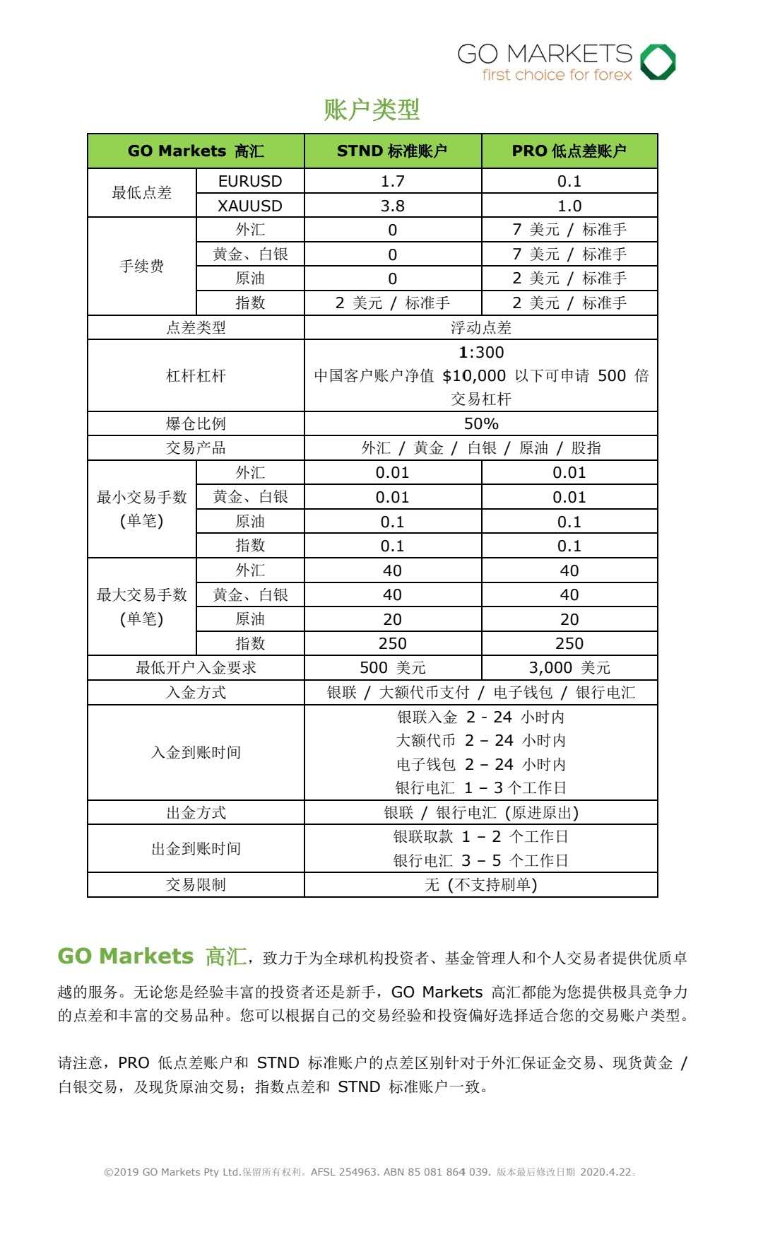 GO Markets 高汇,是澳洲史书上首家荣获外汇营业资历的经纪商,创立于2004 年,正在2004年受到澳大利亚证券与投资委员会 (ASIC:Australian Securities and Investment Commission) 羁系,正式取得澳大利亚金融效劳执照 (AFSL 编号:254963) 所授权的外汇营业资历,是澳洲史书上最悠长的 MT4 正在线平台总统。公司总部设正在澳大利亚 古代金融核心墨尔本市。仰仗赶过 10 年的行业领先上风和雄厚的外汇营业体味,2014 年 GO Markets 高汇正式进入中邦墟市,帮力更众中邦客户竣工出色共赢。