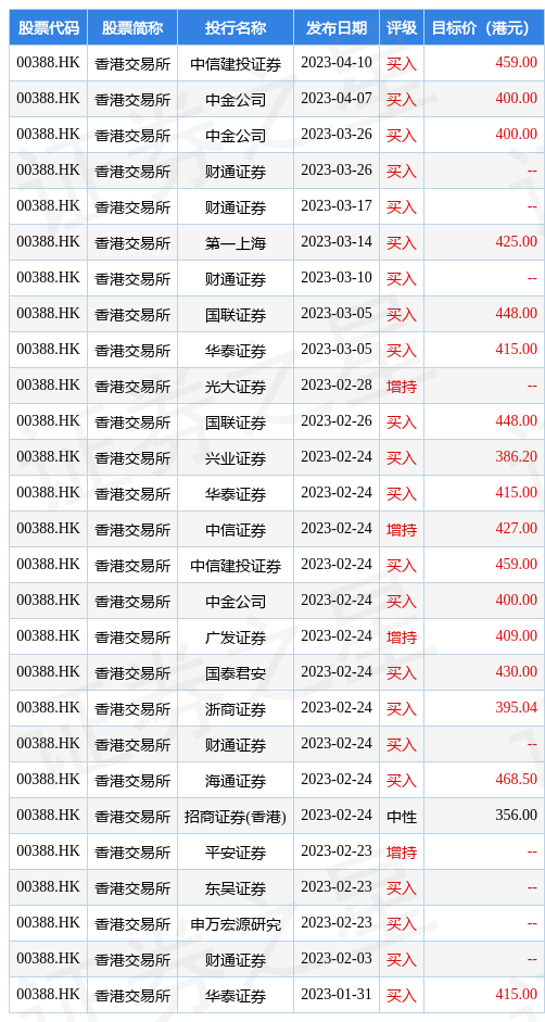 截至2023年4月17日收盘,香港业务所(00388.HK)报收于348.4港元,上涨1.1%,换手率0.25%,成交量311.13万股,成交额10.77亿港元。投行对该股的评级以买入为主,近90天内共有22家投行给出买入评级,近90天的目的均价为419.76港元。中信筑投证券最新一份研报赐与香港业务所买入评级,目的价459港元。