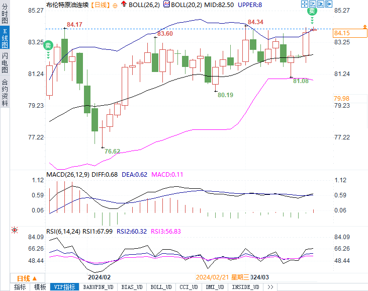 截至发稿时,布伦特原油不断合约报价为每桶84.15美元,较前终生意日上涨0.12美元,涨幅为0.14%。美邦西德克萨斯中质油(WTI)不断合约报价为每桶79.83美元,较前终生意日上涨0.24美元,涨幅为0.29%。这两份合约正在周三均上涨约3%,触及四个月高点。