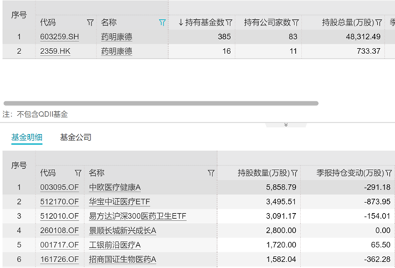 动作机构重仓股,截至2023年四时度末,共有385只公募产物持有药明康德,涉及83家基金公司,持股总量到达48312.49万股,比较上季度末,公募对其选用减持操作,团体持仓改观删除了8874.47万股。