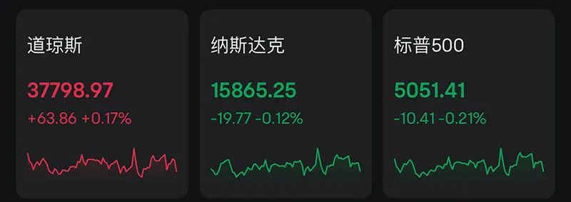 股市方面,美股三大指数涨跌纷歧。截至收盘,道指涨63.86点,涨幅为0.17%,报37798.97点;标普500指数跌10.41点,跌幅为0.21%,报5051.41点;纳指跌19.77点,跌幅为0.12%,报15865.25点。