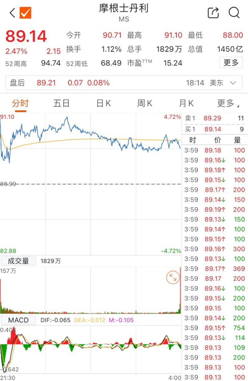 受一季度功绩远超预期提振,摩根士丹利16日以超4%的涨幅高开,随后股价永远保持正在高位。截至收盘,该公司股价收涨2.47%,报89.14美元/股。