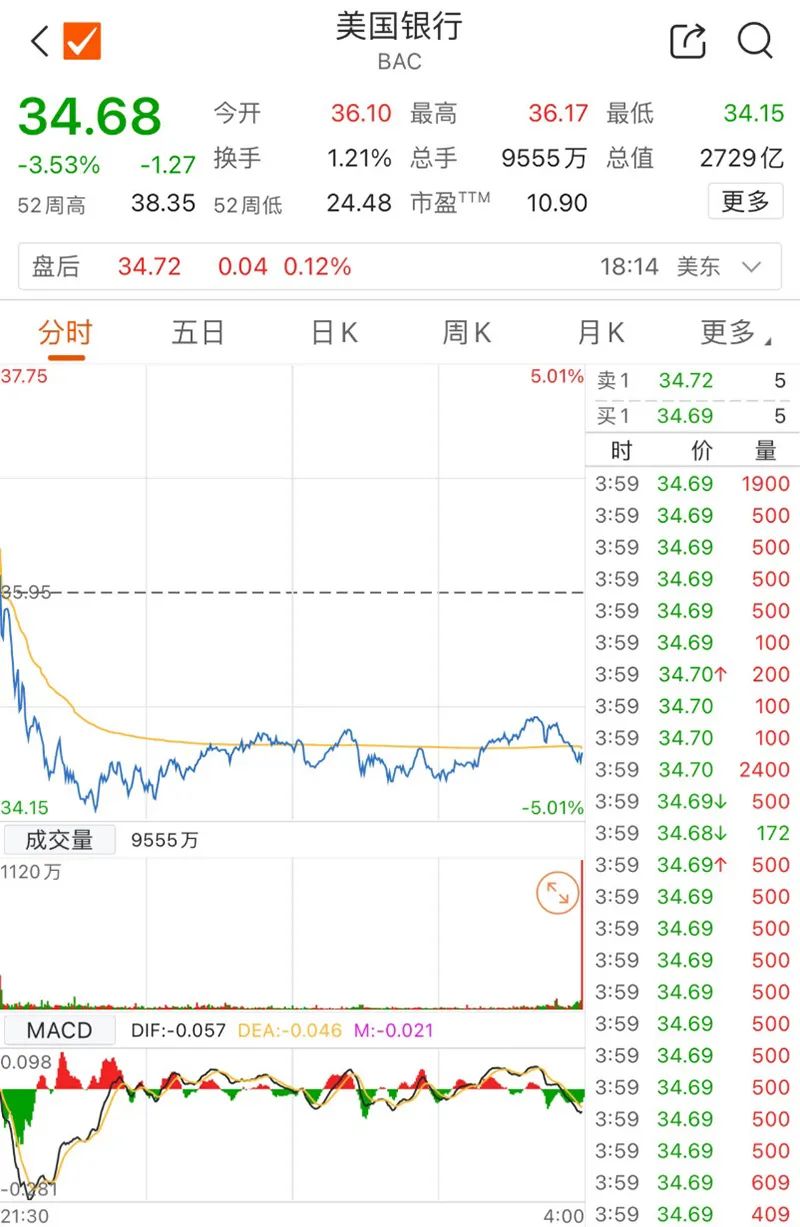 功绩不足昨年同期直接影响了美邦银行当日股价。财报宣告后,美邦银行股价盘中一度跌逾5%,为2023年3月往后最大盘中跌幅。截至收盘,公司股价收跌3.53%,每股股价为34.68美元。