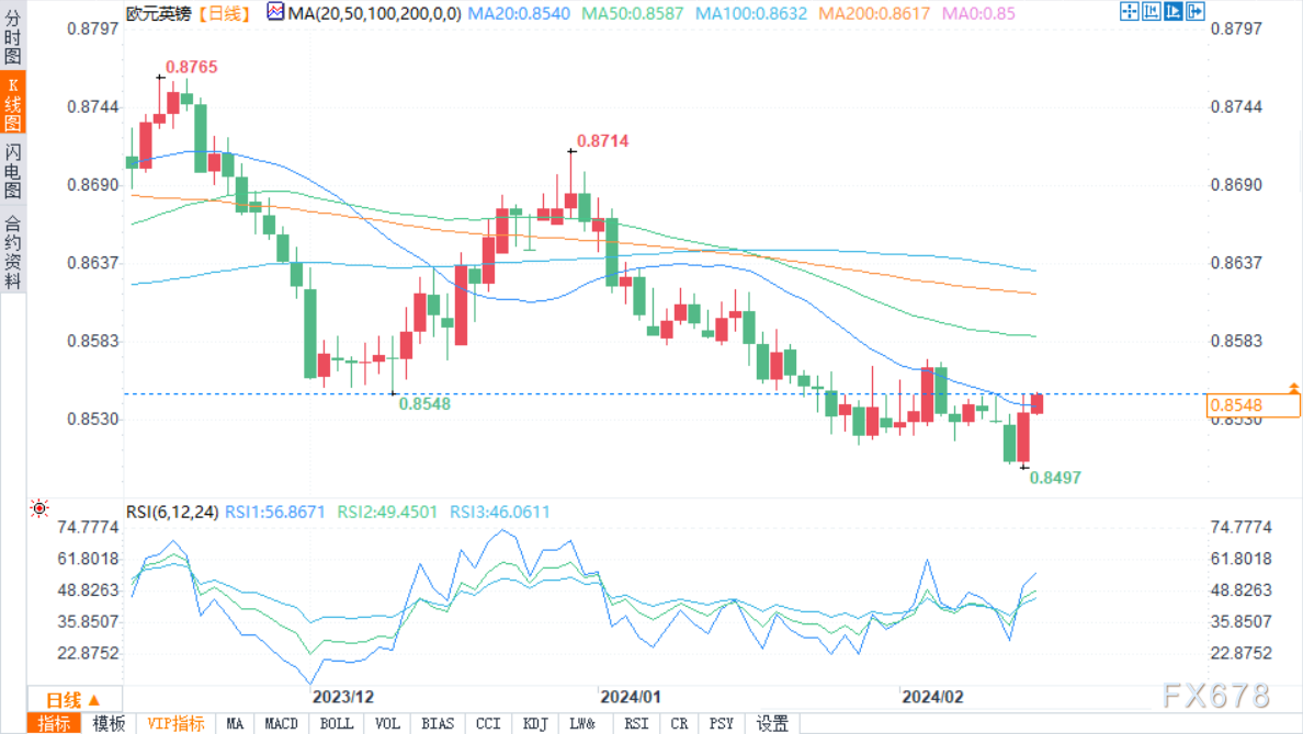 自2023年12月下旬今后,欧元/英镑不停处于接续下跌趋向中,正在通盘走势中创作了较低高点和较低低点,导致英镑从峰值到低谷暴跌了约2.5%。本周,该钱币对跌至近六个月来的最低点,随后正在0.8500驾驭的环节本事底部反弹后小幅回升。