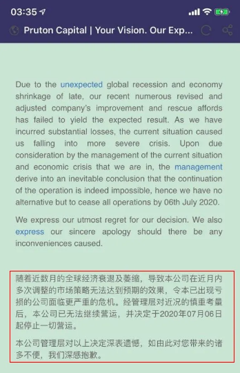 事过一月,PTFX普顿又揭橥了一则告示:跟着数月的圈球经济没落及萎缩,导致本公司正在近月内众次调剂的实锤计谋无法抵达预期的结果,令本已显示耗损的公司面对更主要的维基。经处理层对现状的小心考量后,本公司已无法接续营运,并决意于2020年07越06日起阻止一起运营。