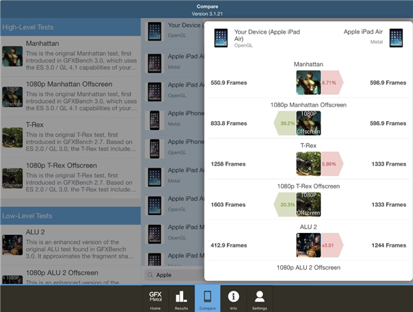 跨平台对比也更具意义_fxcm福汇时隔快要一年之后,苹果APP Store的GFXBench Metal结果迎来了更新,对前次更新之后发售的新机型以及新版iOS体系供应了适配和优化,换句话来说,苹果用户结果又能正在iOS体系上操纵这款跑分软件测试自身硬件的GPU功能了。