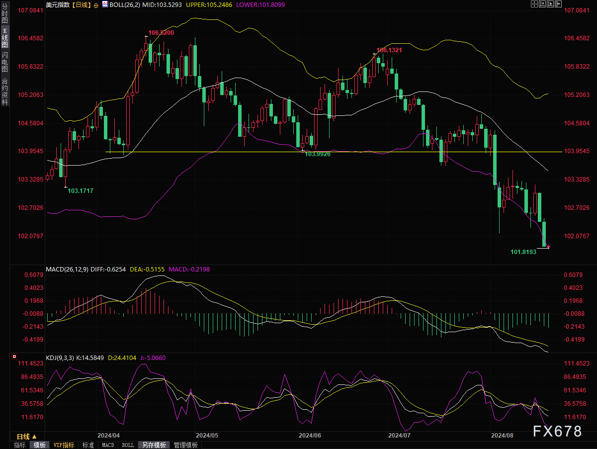 汇通财经APP讯——周一(8月19日)美盘时段,美元指数盘中走跌,报101.9420,跌幅0.46%。 src=