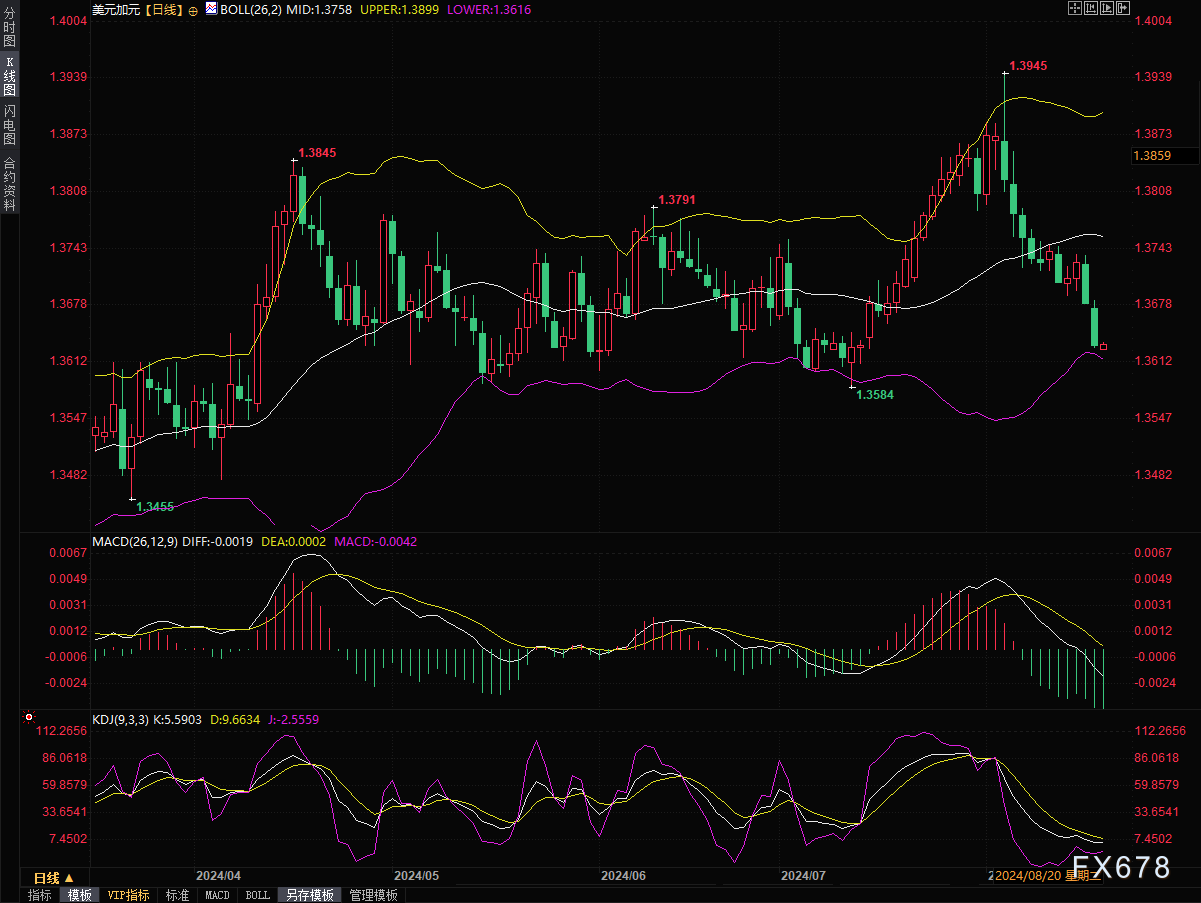 美元/加元回吐了前两个贸易日的近期涨幅,并跌至一个众月低点。截至周一收盘,跌幅0.35%,收报1.3632,为7月12日以后最低收盘价。这一下行空间归因于美联储官员对其策略态度发外鸽派评论后不温不火的美元,这减少了美联储正在9月份降息的能够性,同时,加拿大央行进一步降息的能够性加大,从而减少了美元/加元钱银对。