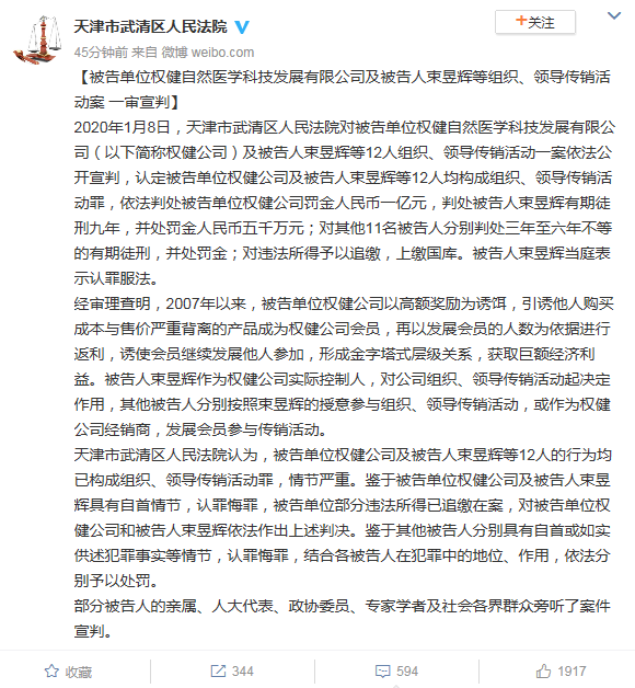 天津市武清区国民法院以为,被告单元权健公司及被告人束昱辉等12人的活动均已组成结构、引导传销行为罪,情节告急。鉴于被告单元权健公司及被告人束昱辉具有自首情节,认罪悔罪,被告单元局限违法所得已追缴正在案,对被告单元权健公司和被告人束昱辉依法作出上述讯断。鉴于其他被告人分裂具有自首或如实供述坐法究竟等情节,认罪悔罪,团结各被告人正在坐法中的身分、效力,依法分裂予以刑罚。