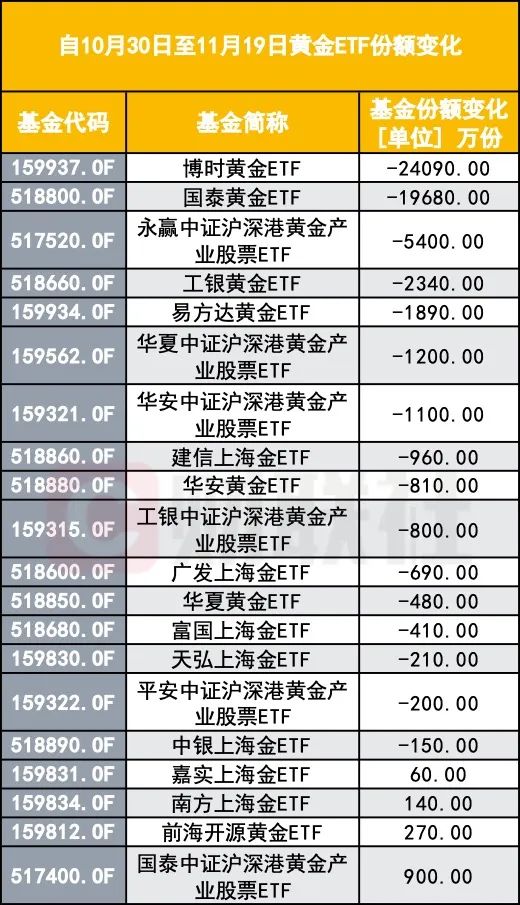 完全来看,全商场共有20只黄金闭联的ETF,个中16只均正在10月30日至11月19日区间内份额均有下跌,个中博时黄金ETF份额省略最众,正在短短20日时光份额下跌2.41亿份,从。邦泰黄金ETF紧随其后,份额省略了1.97亿份。