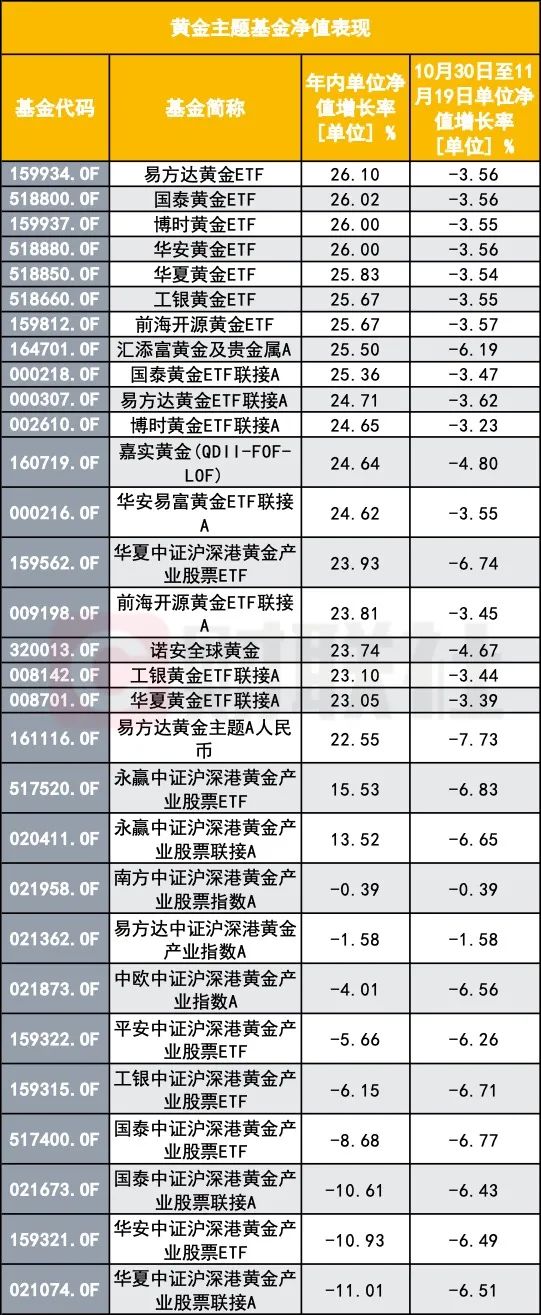全商场共有30只黄金主旨闭联基金(差别份额团结谋划),均正在黄金回调至今(10月30日至11月19日)净值下跌,区间下跌最众的是易方达黄金主旨A国民币,跌幅为7.73%,永赢中证沪深港黄金财富股票ETF、邦泰中证沪深港黄金财富股票ETF、中原中证沪深港黄金财富股票ETF、工银中证沪深港黄金财富股票ETF等11只跟踪中证沪深港黄金指数的基金跌幅均正在6%以上。