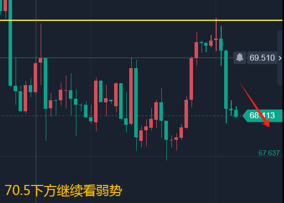 原油昨天走出了冲高回落,精准的正在70.5相近展示回落,基础上是咱们的最高位做空,十分的完满。周线遮住了众头的攻击,这日咱们讲连接以70.5为防守去看回落。点位上合怀69.5和70去进场就好,连接看新低就行!