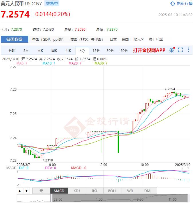 截至发稿,美元兑换群众币汇率报价7.2574,涨幅0.20%,最高价7.2595,最低价7.2370,今日美元/群众币汇率开盘价7.2370。