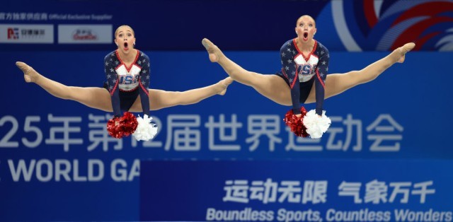 8月16日,美邦组合赫夫特/马丁正在2025年成都寰宇运动会啦啦操双人花球半决赛第二轮竞争中。新华社记者 梁旭 摄