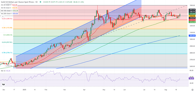 Sengezer指出,因美联储主席鲍威尔正在杰克逊霍尔选取鸽派语气,黄金众头醒悟。金价上周五大幅回升,但仍低于3400美元/盎司。身手眼前景暗意近期方向看涨。
