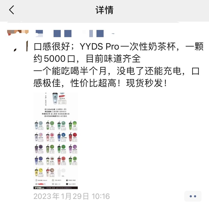 一次性奶茶杯电子烟,便是此中最受迎接的产物。正在线下门店,仍有雇主漆黑售卖奶茶杯;正在线上微商等渠道,奶茶杯也是热门产物,好友圈中充足着不少海报。微博上,“奶茶杯”超线篇帖子,绝大个人实质是正在线求购和微商广告。