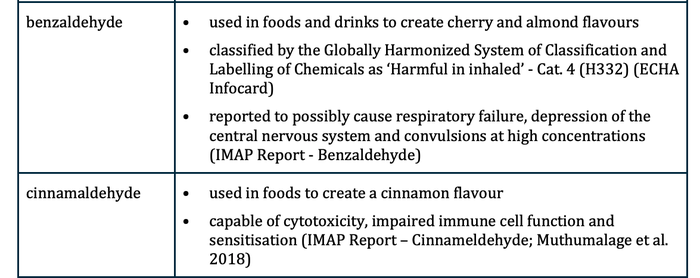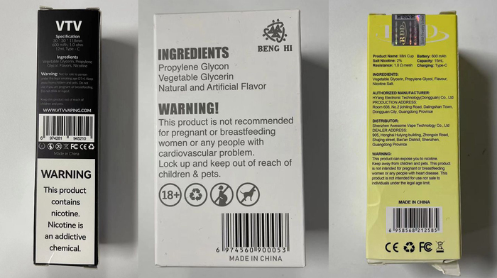 另有两款产物测出含有肉桂醛与苯甲醛因素,这是两种常睹的浓郁醛物质,分手用于模仿肉桂滋味和杏仁滋味。可是,它们都不是电子烟邦度圭表中被准许的增添物。
