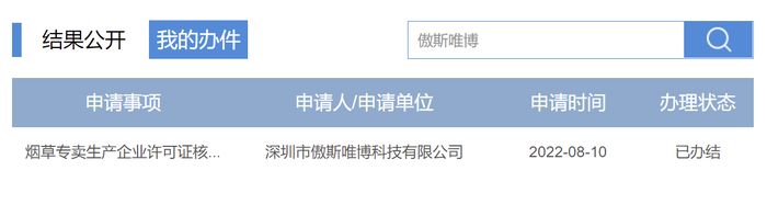 界面音讯找到一款写明音讯的“DK”品牌产物,其分销商为“Shenzhen Awesome Vape Technology Co., Ltd”,对应为“深圳市傲斯唯博科技有限公司”,正在邦度烟草专卖局上可查问到,该公司确实已取得烟草专卖出产企业许可证。