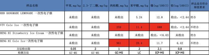 正在澳大利亚电子烟圭表TG110中,肉桂醛和苯甲醛被昭着列为禁用物质。赵彦说,推敲到原料污染或者工艺进程,准许其微量存正在于产物中,限值请求为10mg/kg。此次送检产物中有的肉桂醛因素高达961mg/kg,凌驾圭表96倍。