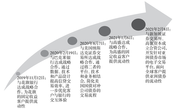 2021年2月,Trumid与新加坡证券业务所(SGX)和高瓴资金创造合伙公司XinTru,策划正在2021年推出对准亚洲债券业务市集的Trumid XT 平台。此次合营调解了Trumid正在固收界限的本事、SGX正在亚洲金融市集根底措施和电子业务方面的履历,以及高瓴资金正在亚洲金融办事界限的专业学问和干系搜集。举动北美和亚洲市集的“桥梁”,Trumid XT将连通Trumid Market Center和SGX Bond Pro板块,为亚洲市集的固收业务供应滚动性赞成,胀舞亚洲债券电子化业务迈向新阶段,同时助助邦际投资者收拢亚洲债券市集的投资机遇,为环球客户创作价格伸长空间。