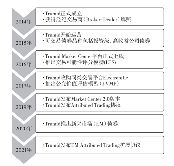 Trumid创造于2014年,总部位于美邦纽约,是一家一心债券电子化业务的另类投资平台。Trumid具有美邦金融业囚系局(FINRA)的经纪业务商执照,同时照旧美邦证监会(SEC)注册的另类业务体系(ATS)运营商。Trumid的主营产物是一个面向经纪商(dealers)、对冲基金(hedge funds)和资产约束公司(asset managers)的电子债券业务平台,为债券营业两边供应一个匿名业务园地,通过数据管制本事和搜集领域效应协助营业两边举行讲和或业务。目前,Trumid供应的可业务债券种类厉重征求高收益债券(High Yield Bonds)、投资级债券(Investment Grade Bonds)、新兴市集债券(Emerging Market Bonds)和信用违约交流赞同(CDS)。截至2021年5月,Trumid的用户数目超530家,年收入约为3500万~5000万美元,日均业务额约为19亿美元,公司估值约为14亿美元。